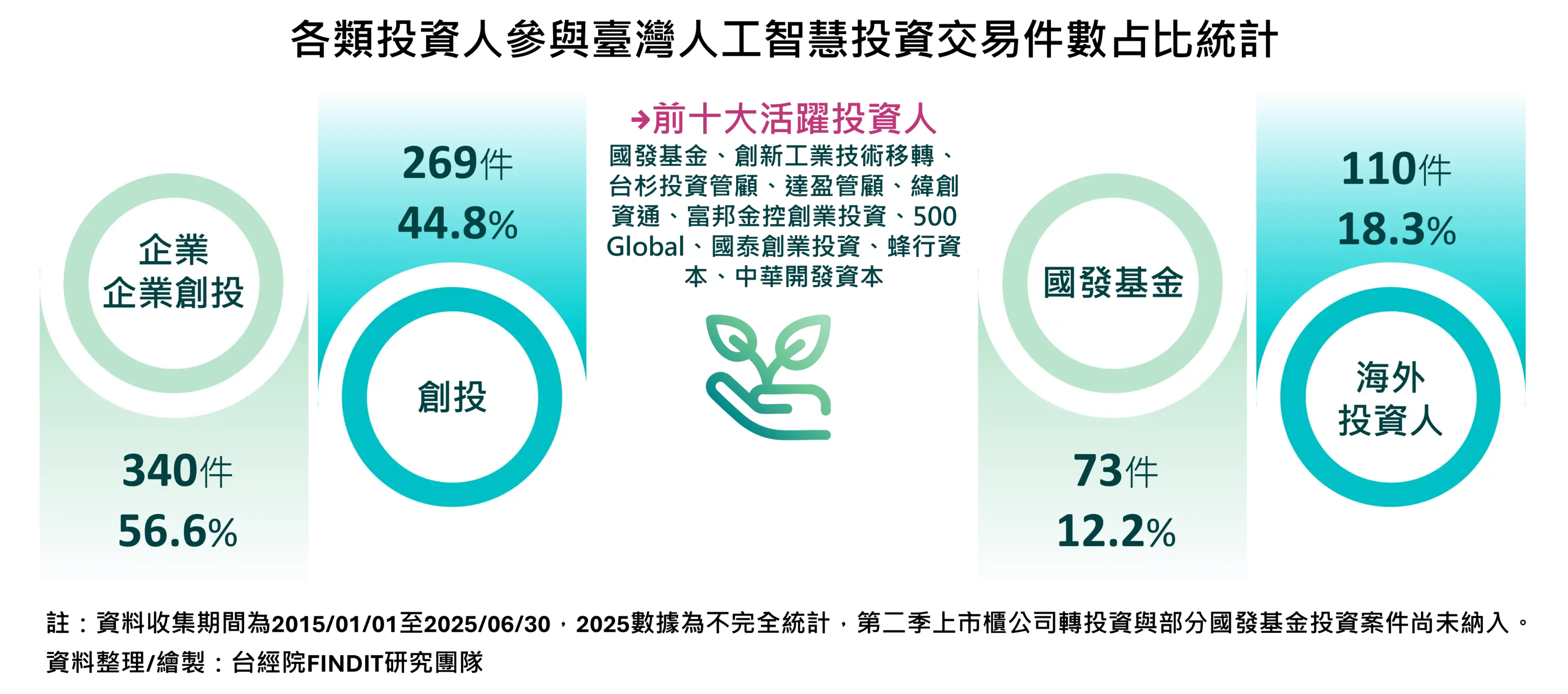 除了瞭解整體獲投企業的交易趨勢外,以下從投資人切入,有助瞭解資金市場的參與者及活躍法人。據FINDIT 研究團隊所掌握臺灣人工智慧獲投的601件交易中,企業創投參與340件,比例最高,占總投資件數約56.6%,其次是創投共有269件、占總投資件數約44.8%,海外投資人共有110件、占總投資件數約18.3%,最後是國發基金共有73件、占總投資件數約12.2%。