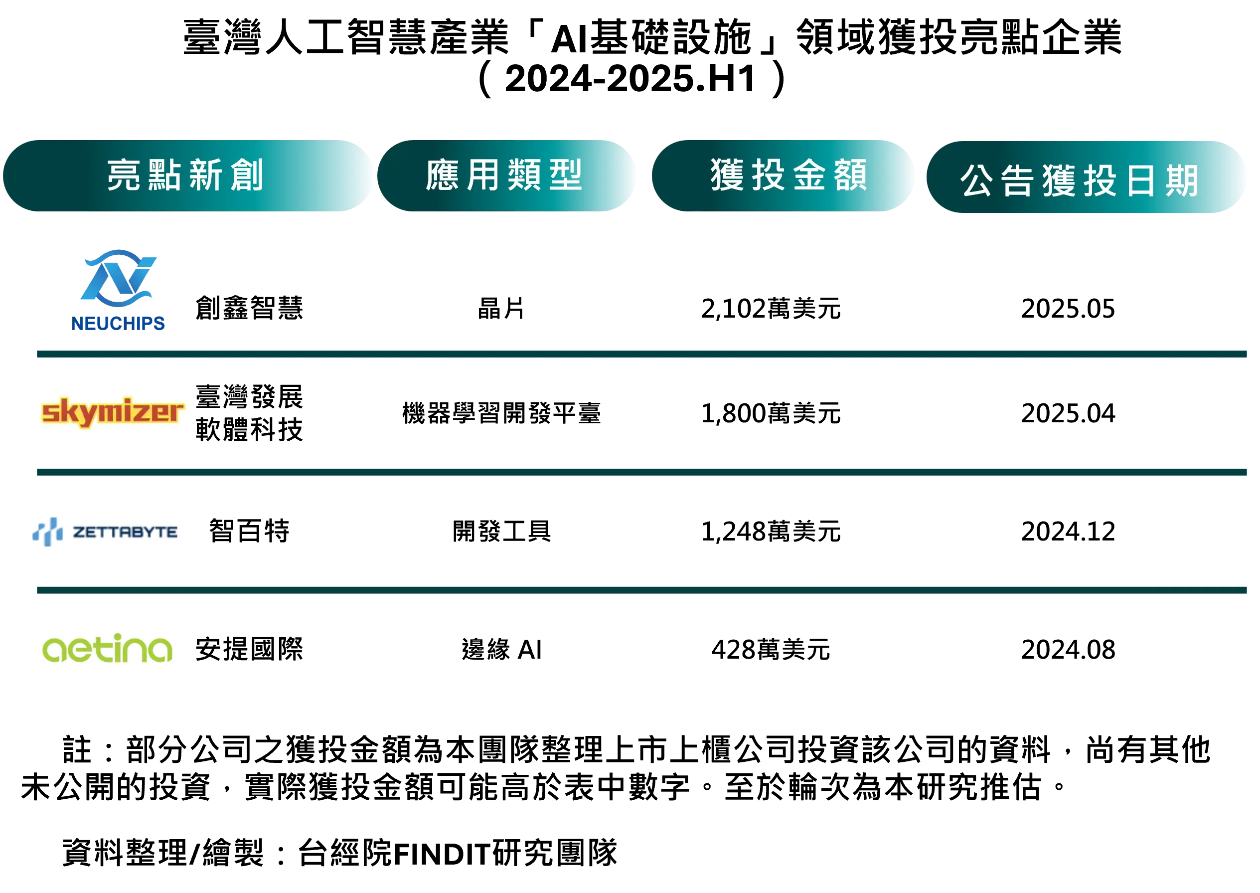 將觀察期間聚焦在2024年至2025年6月,該領域的獲投交易金額共8,729萬美元、交易筆數15筆,其中,AI晶片獲投3筆交易金額2,553萬美元、Edge AI獲投4筆交易金額906萬美元,以及機器學習開發平台獲投2筆交易金額2,171萬美元,考慮到獲投的交易金額以及該領域中熱度集中的應用,本研究挑選四家企業深入瞭解臺灣人工智慧在大規模的AI模型及軟硬體設備應用面的早期獲投企業。