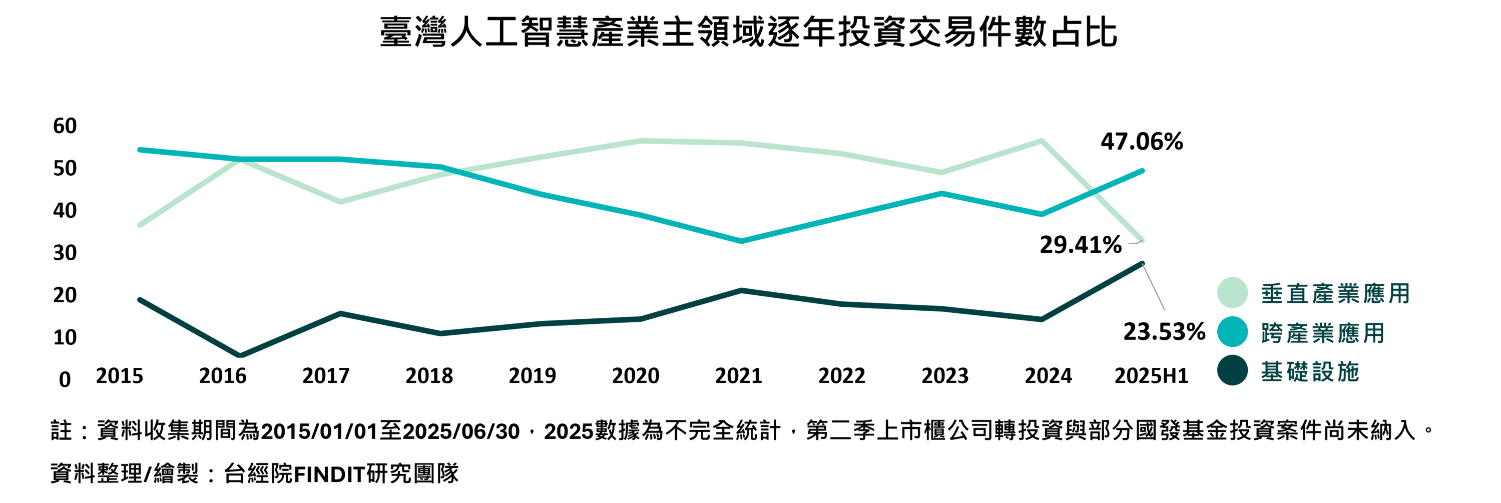 起初,人工智慧市場投資全面加速,市場取向趨向於「大語言模型」,模型推陳出新的速度與大金額投資的件數似乎成正比,整體氛圍環繞著更高效能、更廣泛應用的模型,來到2024年,AI軍備競賽的成本已被推高到不是一般新創能夠玩得起的地步,加上先前一股腦投資的企業與投資人期望看見真正的成果,漸漸地更經濟實惠且派得上用場的技術更加備受討論,能夠省錢又保有效能的模型供應商嶄露頭角,以及專注在特定領域開發深入產業專屬技術的新創成為接下來的趨勢,截至2025年上半年臺灣主領域獲投占比翻盤,跨產業領域獲投數占比推升,高於垂直產業領域,其趨勢與全球人工智慧市場相近。