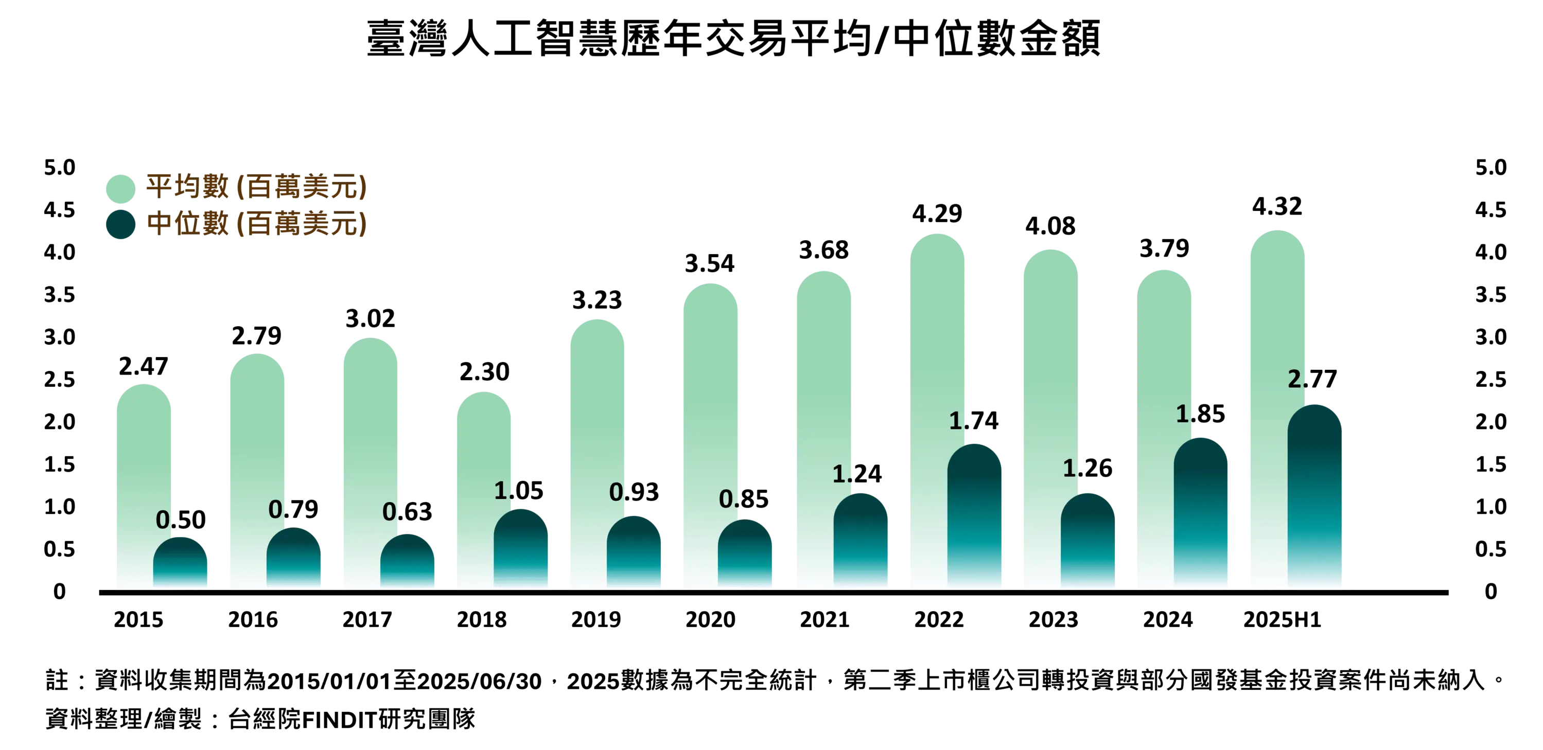 來到2025年,據前述提到的臺灣產業AI化大調查,過去兩年來企業對AI的認知顯著提升,即便如此,真正如何落實應用仍是臺灣面臨的挑戰,隨著全球人工智慧市場發展趨向重視企業應用和深入產業的技術,臺灣政府也在2025年規劃人工智慧基本法草案,政策和補助持續注入的背景下,臺灣AI新創有望發展更多元及純熟。新創企業投資交易方面, 2025年截至6月止,累積1億4,703萬美元的交易金額、34筆投資交易,整體狀態有望在年底再度達2億美元以上的投資金額,不僅平均金額再創紀錄,交易金額中位數也打破高點, 整體產業發展越趨全面。