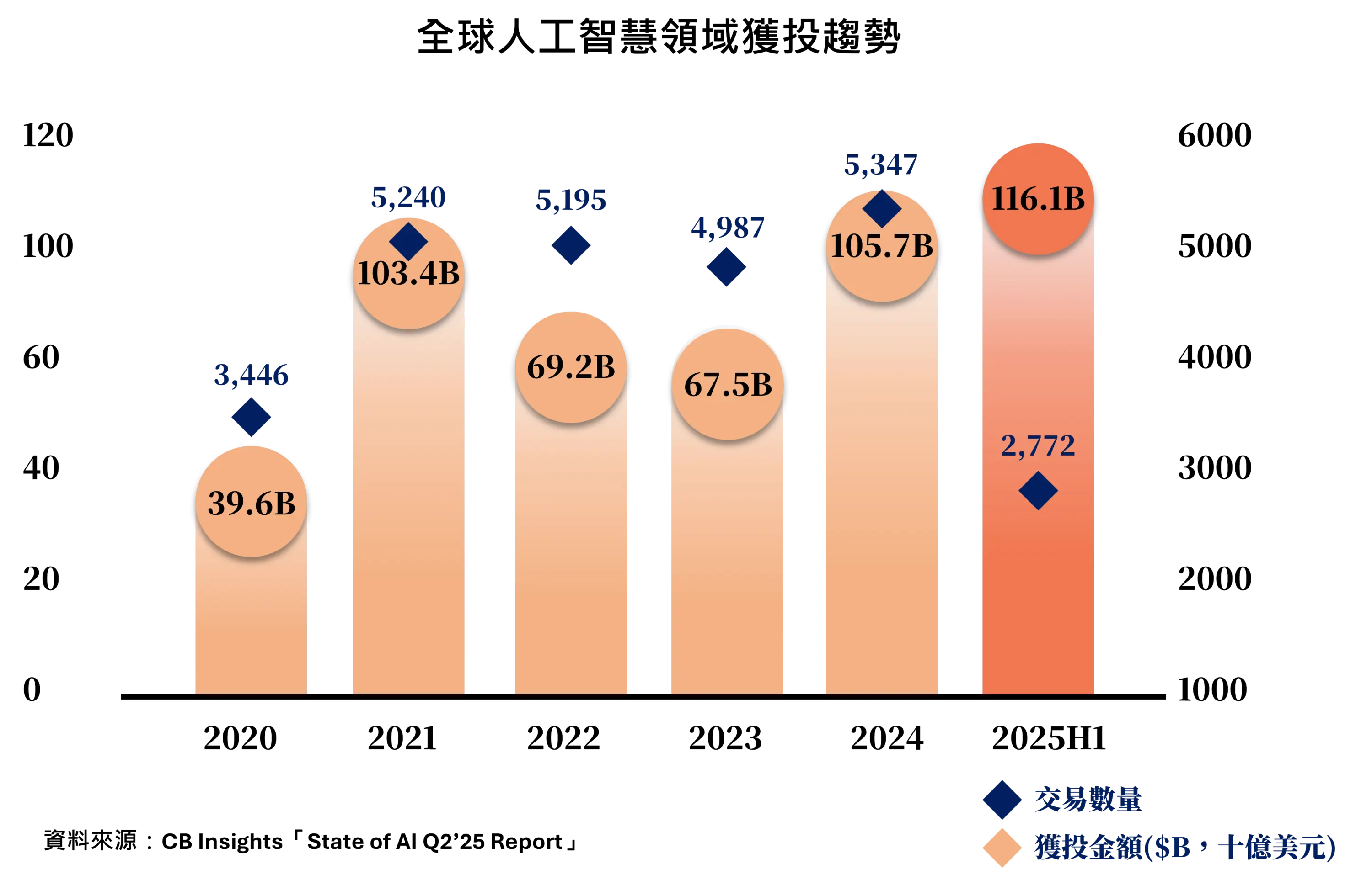 人人都想搭上金流特快車,人工智慧正推動史上最大規模的技術變革:2024年間,技術推新的速度快到令人摸不著頭緒,唯一能夠確定的是它對於各行各業的影響持續在發生,挹注在基礎設施上的投資金額不斷突破大家想像,不難看出人工智慧產業燒錢速度之快,且競爭只會更加激烈,兼顧效能與節省成本將成為下一個主流。根據CB Insights報告,人工智慧早期資金市場的表現在2025年第二季共獲得1,403筆投資,吸引473億美元的資金,自2024年第四季創新高後,2025年第一季再將單季獲投最高紀錄推至689億美元,歸功於Open AI的400億美元鉅額投資,整體而言注入在人工智慧領域相關新創的投資金額正以驚人的速度在成長,以交易件數而言,2024年第三季達到1,479筆的紀錄後稍微衰減,但以平均而言,獲投金額自2022年便逐年攀升,投資人投資的目標越發明確。