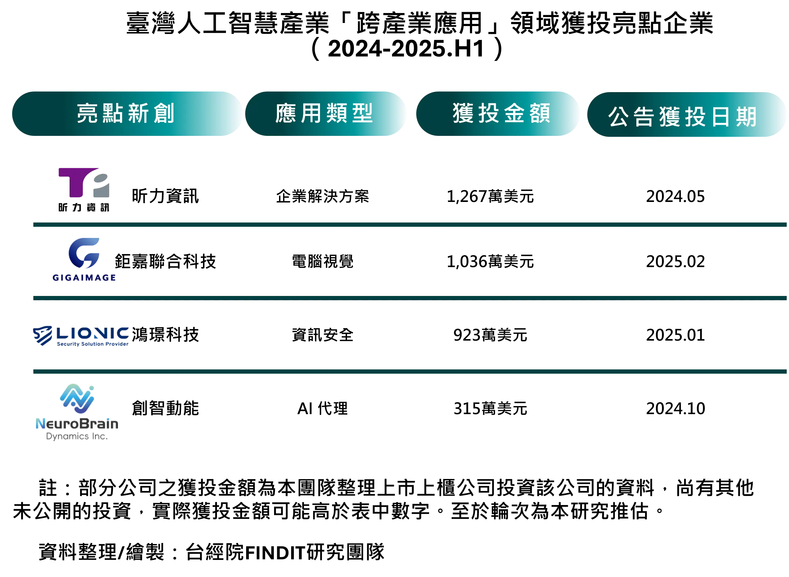 在2024年至2025年6月的交易中,國發基金共參與了11件投資交易,應用層面包括6件跨產業應用如AIoT、企業解決方案和智慧工廠,另外,還有5件垂直產業應用如健康醫療、汽車和運動科技,由近一年國發基金所參與投資的新創樣貌也可以觀察跨產業應用和垂直產業應用的熱度再度提升。