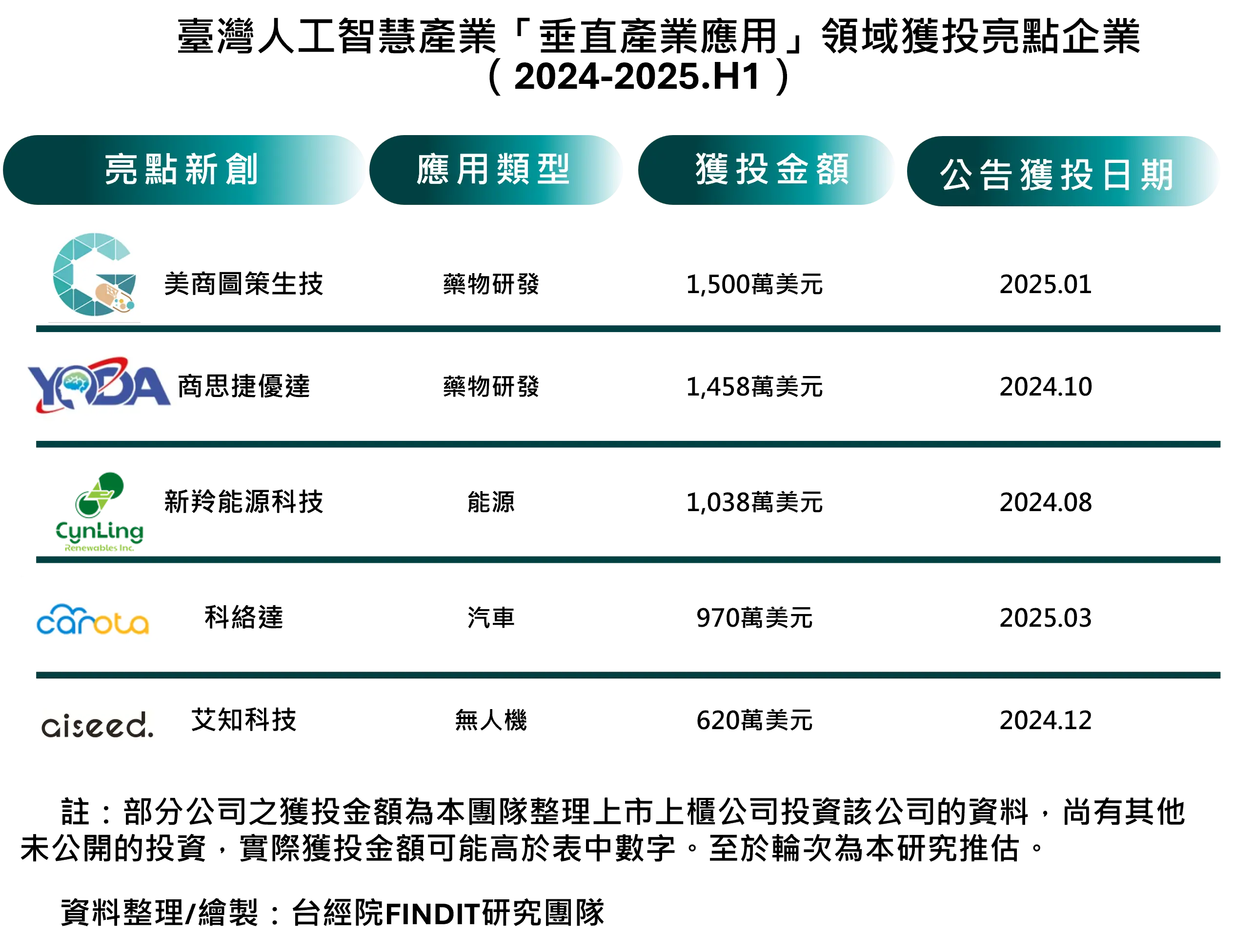 將觀察期間聚焦在2024年至2025年6月,該領域的獲投交易金額共2.26億美元,其中獲投金額前五大應用包括健康醫療(7,520萬美元)、無人機(3,833萬美元)、行銷科技(3,321萬美元)、藥物研發(2,958萬美元)和金融科技(1,441萬美元);交易筆數則共有51筆,占比前三大應用包括健康醫療(49.02%)、行銷科技(9.8%)和無人機(7.84%),考慮到獲投的交易金額以及該領域中熱度集中的應用,本研究挑選五家企業以深入瞭解近一年臺灣人工智慧在垂直應用面的早期獲投企業。