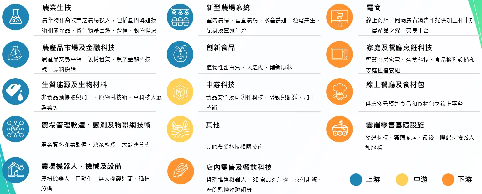 本文所定義的食農科技企業,為具有技術創新或商業模式創新者。此外,參考AgFunder分類,可依產業供應鏈區分為:上游科技,包括農業生技、農產品市場及金融科技、生質能源及生物材料、農場管理軟體、感測及物聯網技術、農場機器人、機械及設備、新型農場系統、創新食品;中游科技、其他,如酒類管理;下游科技,包括店內零售及餐廳科技、電商、家庭及餐廳烹飪科技、線上餐廳及食材包、雲端零售基礎設施,如下圖所示:
