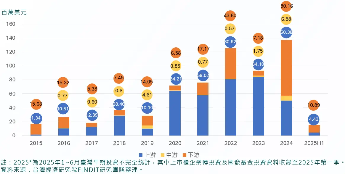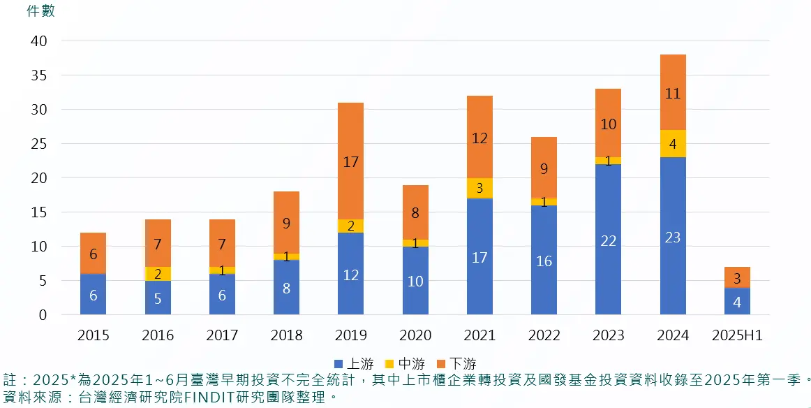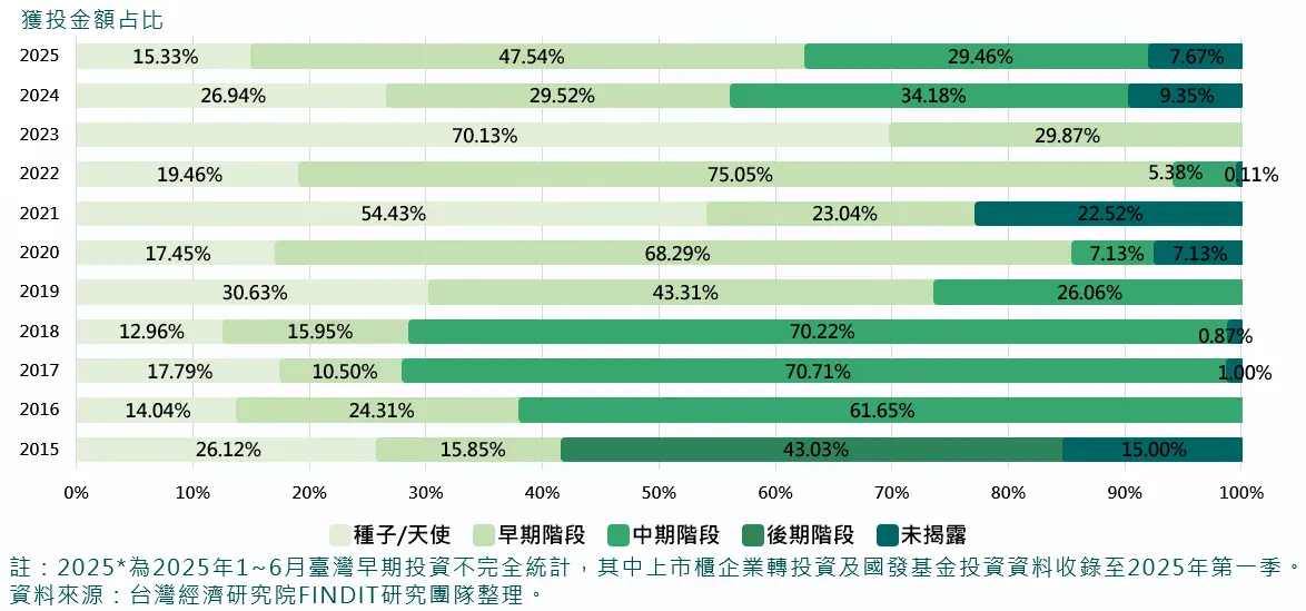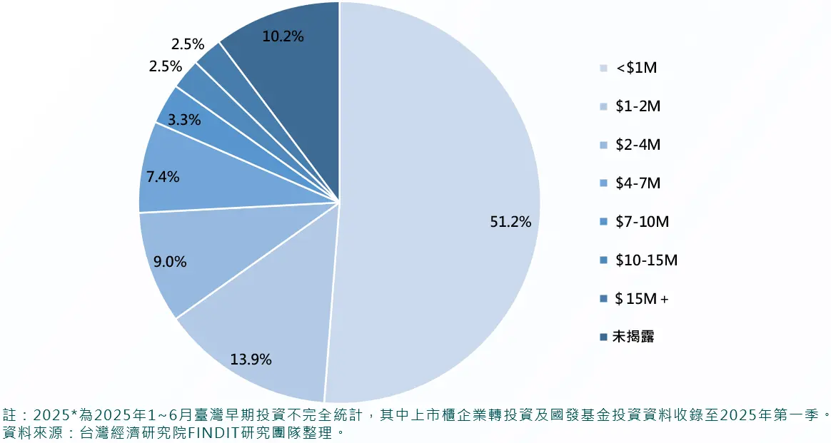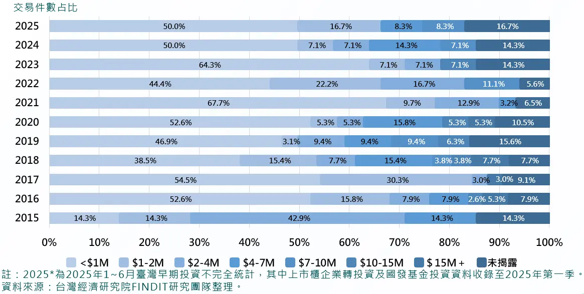 2020年起至2024年受疫情影響與熱錢持續推動,獲投平均數大幅拉高,主要由少數大額投資案驅動,中位數則僅小幅上升,顯示資金集中於少數新創。值得注意的是,2025年上半年出現平均數下降、中位數上升的現象,且中位數首度超過平均數,顯示市場出現結構性變化,超大額投資減少,資金分配更趨平均。