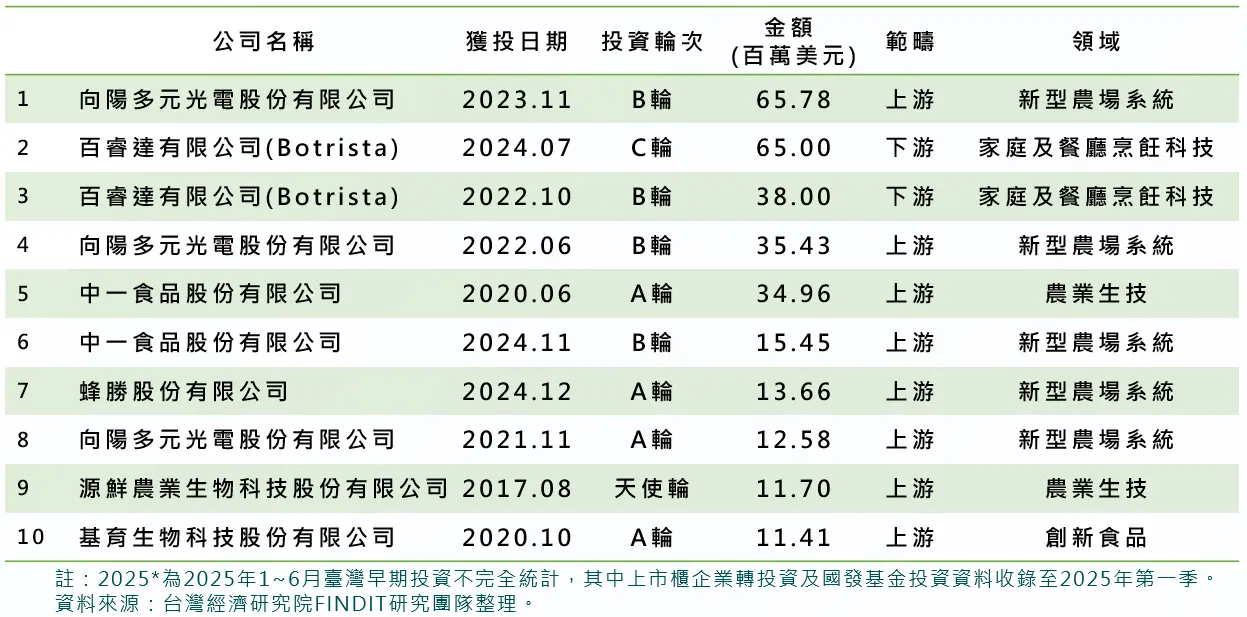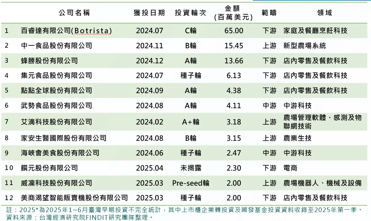 2024年至2025年6月間臺灣食農科技領域中獲得超過200萬美元投資金額的交易共計12件,顯示資本市場對該產業持續保持關注與投入。百睿達有限公司(Botrista)以6,500萬美元的C輪募資金額,高居榜首;蜂勝、集元、點點全球、美商渥望智能販賣機公司等也成功擠進200萬俱樂部,顯示出投資人愈來愈重視下游領域「消費者端」的創新應用與商業模式。