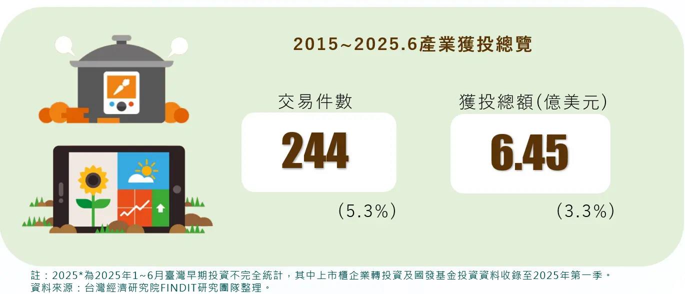 臺灣食農科技領域自2015年至2025年6月的獲投交易共244件,占臺灣早期投資交易4,569筆約5.3%,獲投金額共計6.45億美元,占已揭露之早期投資總金額192.55億美元的3.3%。