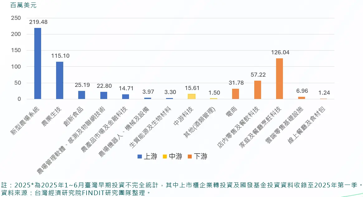整體來看,上游技術導向的新型農業系統與農業生技仍為投資主力,前十名中有八名屬於上游領域,反映出臺灣投資人對於「提高農業效率與科技化」的重視。