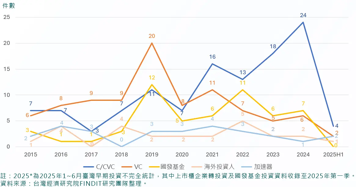 若依時間序來看,公司/公司創投(C/CVC) 2018年起逐漸崛起,並於2024年達到24件的高峰,成為推動臺灣食農投資的主要力量,顯示產業鏈既有企業積極透過投資佈局新創,以掌握技術與市場先機。相較之下,創投(VC)雖在2019年曾出現20件的高峰,但後續逐年下滑,反映傳統創投資金在該領域的熱度逐步退潮。