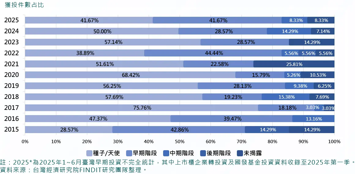 2015至2025年6月期間臺灣食農科技領域的早期投資案件中,獲投企業約有七成四是在5年內成立,顯示早期資金配置仍以年輕企業為主要標的。其中2020年最具代表性,九成五的投資案件皆集中於5年內成立的新創,顯示投資人對新創潛力高度看好。儘管2024年投資件數創下新高,惟5年內企業之占比降至58%,2025年上半年更下跌至43%,顯示部分資金開始轉向已成立較久、技術成熟度與商業模式較穩定的企業,反映投資策略出現結構性調整。