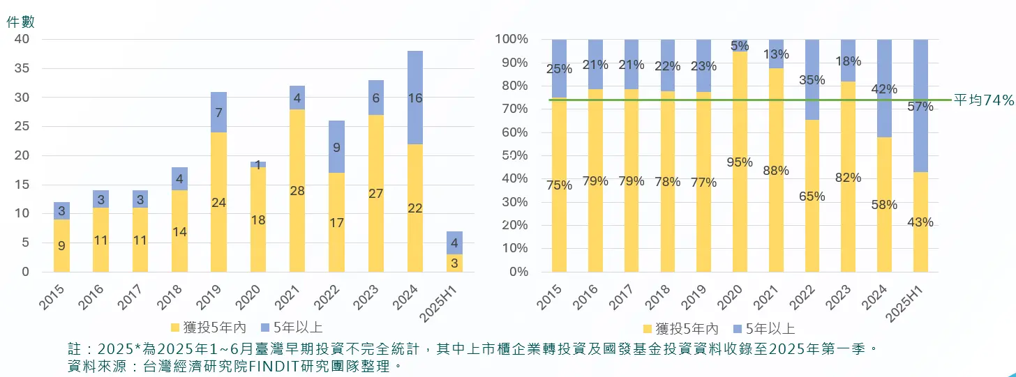 圖10 2015年-2025年6月臺灣食農科技領域獲投統計-成立5年內獲投企業占比分布