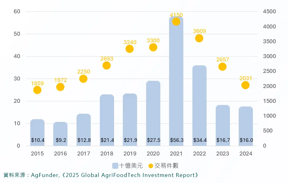 根據美國農業科技募資網站AgFunder於2025年3月發布之《2025年農業食品科技投資趨勢報告》中的數據顯示,2024年農業食品科技新創的投資金額創下七年新低,僅160億美元,較 2023 年下降 4%,交易件數則年減 24%。主要受到總體經濟放緩、創投市場普遍收縮,造成市場整體低迷。然而,至少有一半的受訪創投人士認為市場已經觸底,且部分地區出現回暖跡象。例如美國增加14%、印度增加215%、荷蘭增加118%、芬蘭增加403%及日本增加76%。