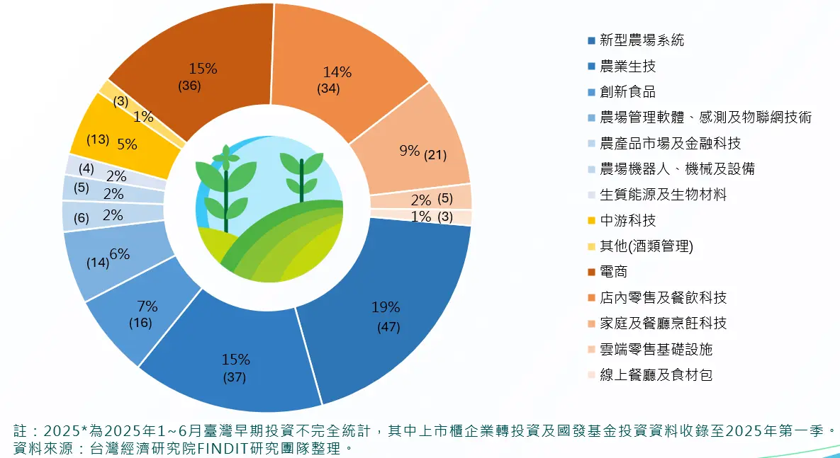 圖6 2015年-2025年6月臺灣食農科技領域獲投統計-件數與占比(分領域)