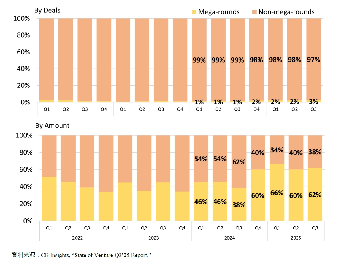 CB Insights統計2025年第三季全球鉅額交易件數為156件,略低於前一季的161件,與去年同期相比增加41.82%。件數占比在整體市場投資熱度減弱的情況下,由前季的2.30%上升至本季的2.64%。另外,交易規模則仍達596億美元的水準,較前一季成長1.87%,規模占比由前季的60.08%上升至本季的62%。