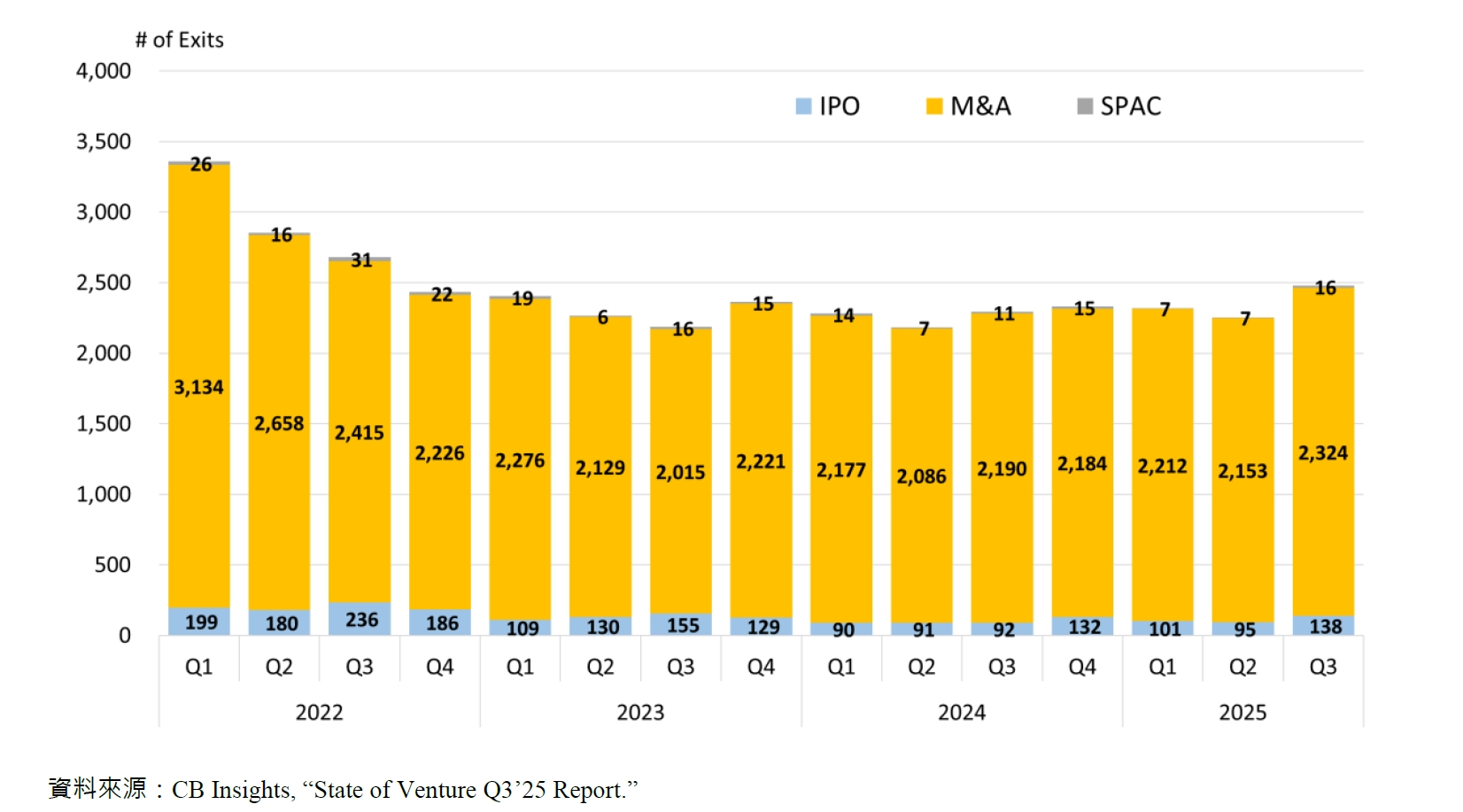 2025年第三季共2,478件創投出場交易案,與前一季的2,255件相比,增加約9.89%,與2024年同期相比則是成長約8.07%。其中,收購(M&A)仍是主要出場路徑,第三季約占93.79%(2,324件),較2025年第二季增長約7.94%,與2024年第三季相比則是成長6.12%。如Allwyn以16億美元收購PrizePicks多數股權(62.3%)。PrizePicks是美國最大的夢幻體育(Fantasy Sports)平台,用戶可以在該平台上選擇不同種類的運動員,並透過該運動員的實際表現贏取獎金。Allwyn則是歐洲大型彩券營運商,欲透過PrizePicks打入北美市場。此收購案對PrizePicks的估值為25億美元,並含績效條件,未來三年估值有機會上升至41.5億美元。