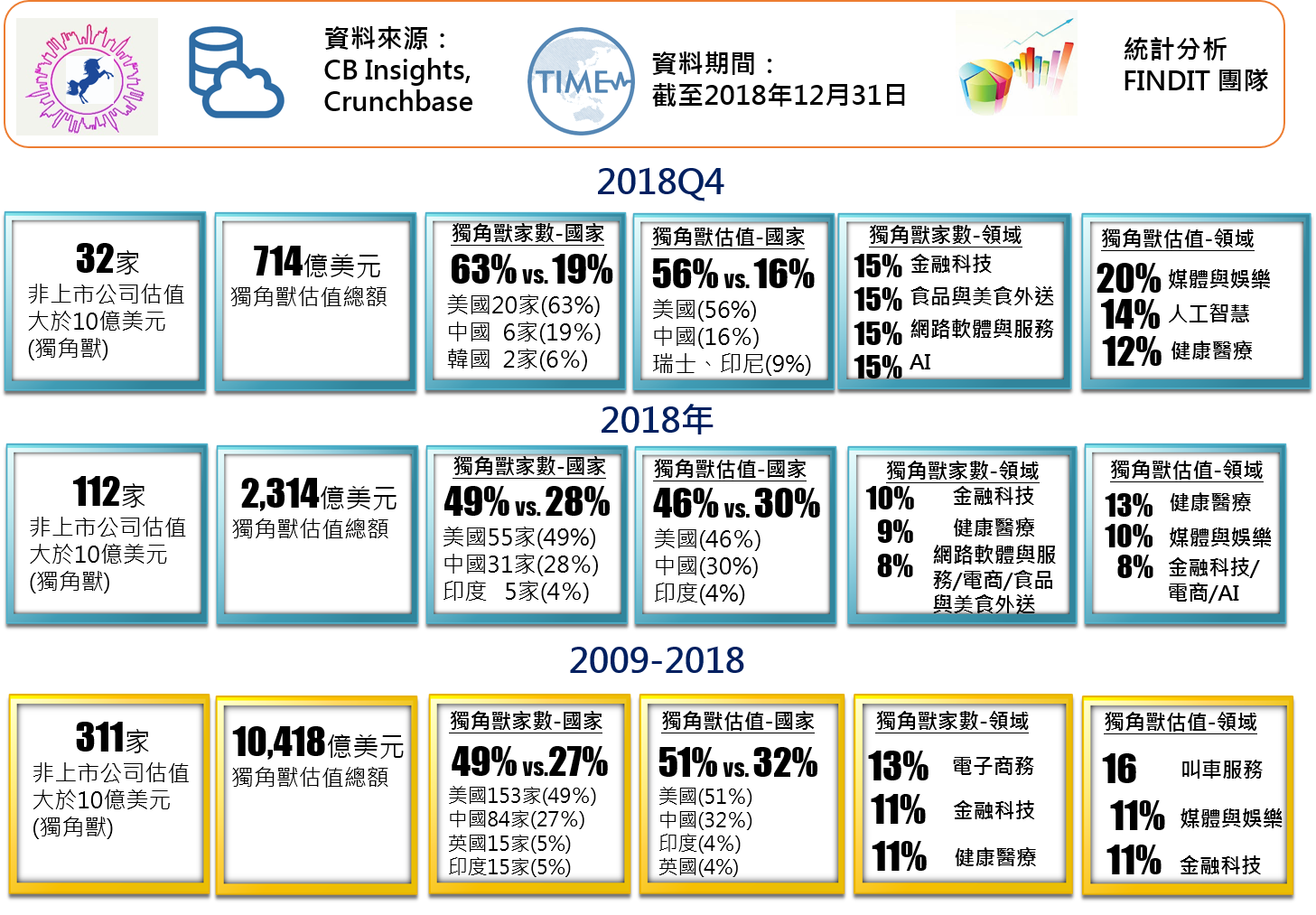 獨角獸家數:2018年第四季增獨角獸計有32家,較上一季少7家。2018全年誕生112家獨角獸,為歷年最多